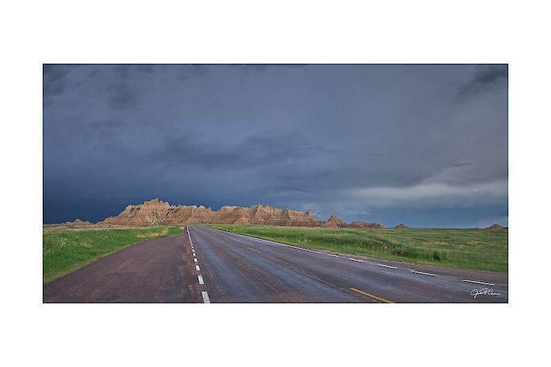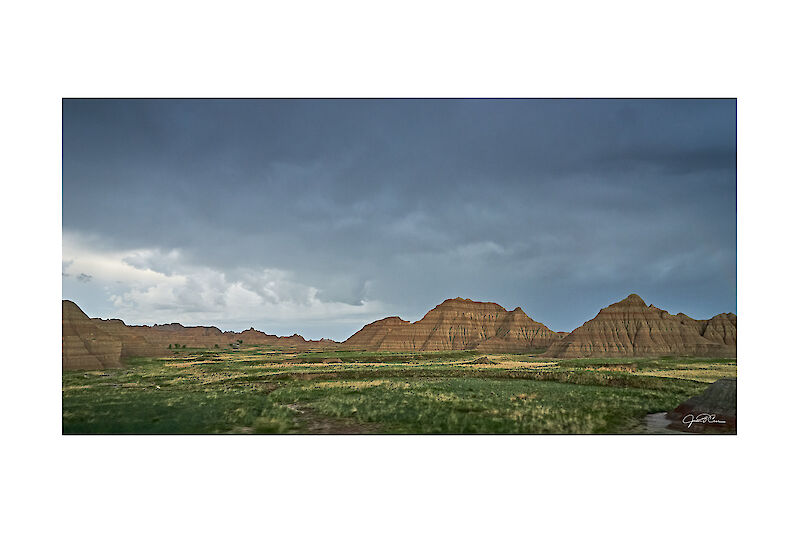This was an amazing way to enter Badlands National Park for the first time. The beautifully eroded landscape stretched out in front of me. It almost looked like a city of pyramids, each made of alternating tan, pink, and red layers. The threatening skies served as a dramatic backdrop. This strange and beautiful place seemed almost like it had been constructed, rather than shaped by the slow processes of nature. It felt architectural.