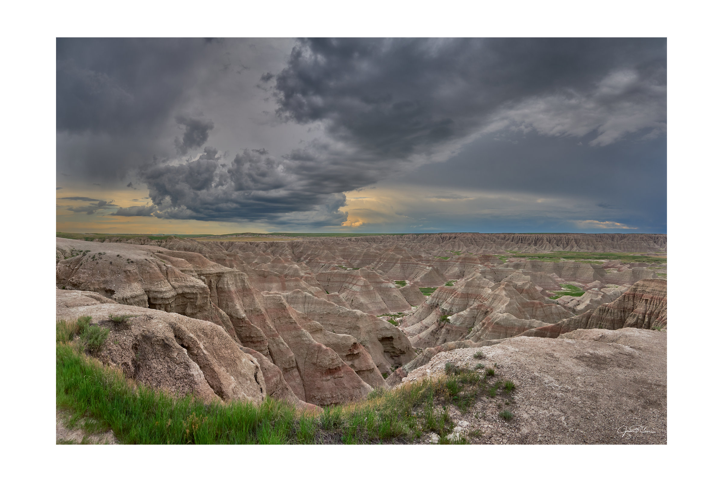Despite my anticipation, I made one more quick stop. Badlands National Park is largely surrounded by Buffalo Gap National Grassland. A large hill provides a scenic overlook with a panoramic view of the northern flank of the grassland. There was finally a significant break in the clouds and the late-day sun was setting what was left aglow. It seemed like I timed things perfectly for my entrance into the national park. After lingering for a few minutes to enjoy the expansive view, I hopped back in the car for the short trip to the park entrance.