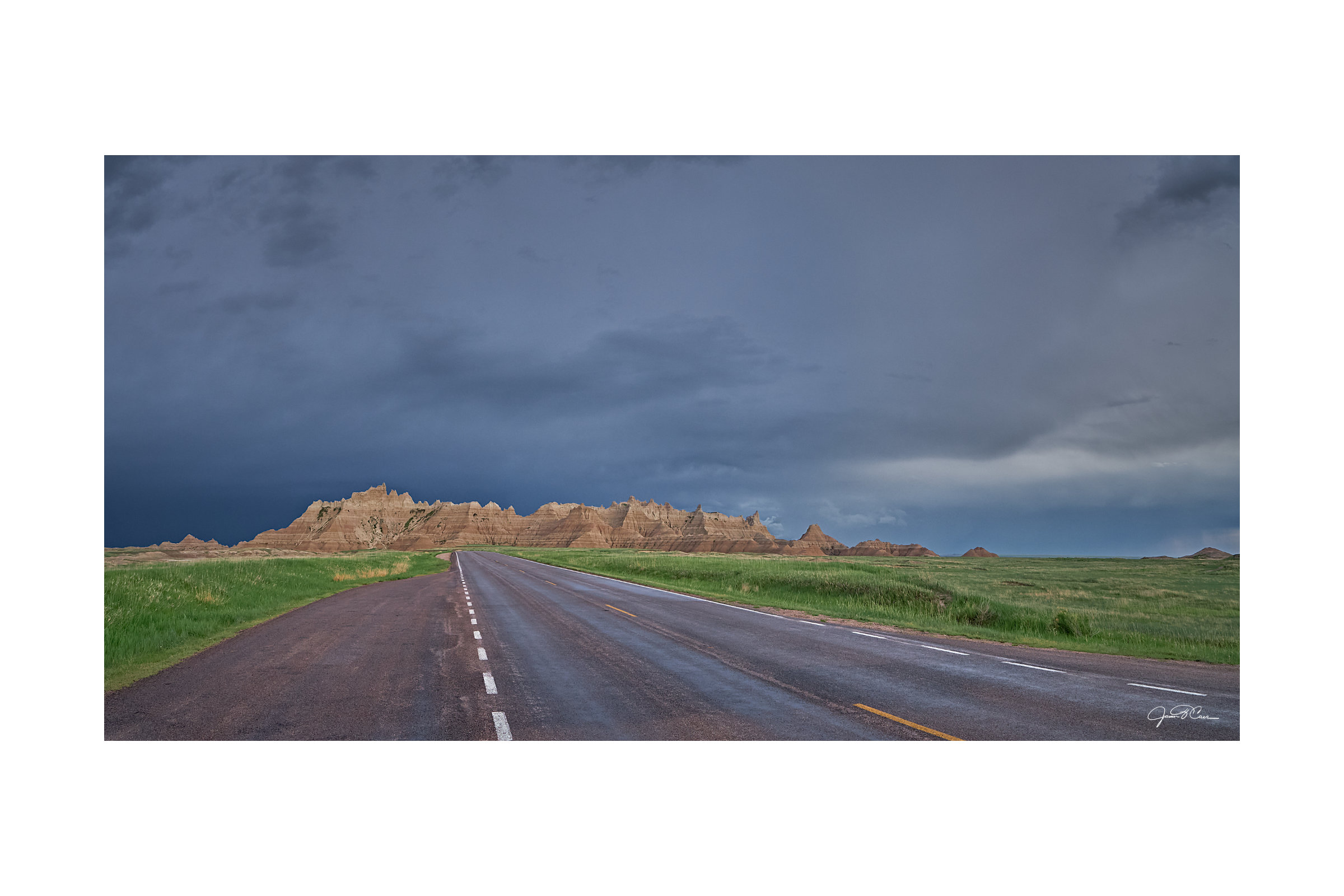 I was getting anxious to stop somewhere for more than a few minutes. Concern over the weather wasn’t helping the anxiety. As I got closer to my destination, the clouds grew darker and darker. At the last rest area before Badlands National Park, the sky turned black and rain poured down in waves. Spectacular bursts of lightning momentarily illuminated the landscape. I was only 45 minutes away and conditions did not seem favorable. The storm quickly blew over, though, and I was back on the road. It wouldn’t be long before the first signs of the Badlands would appear to the southwest.